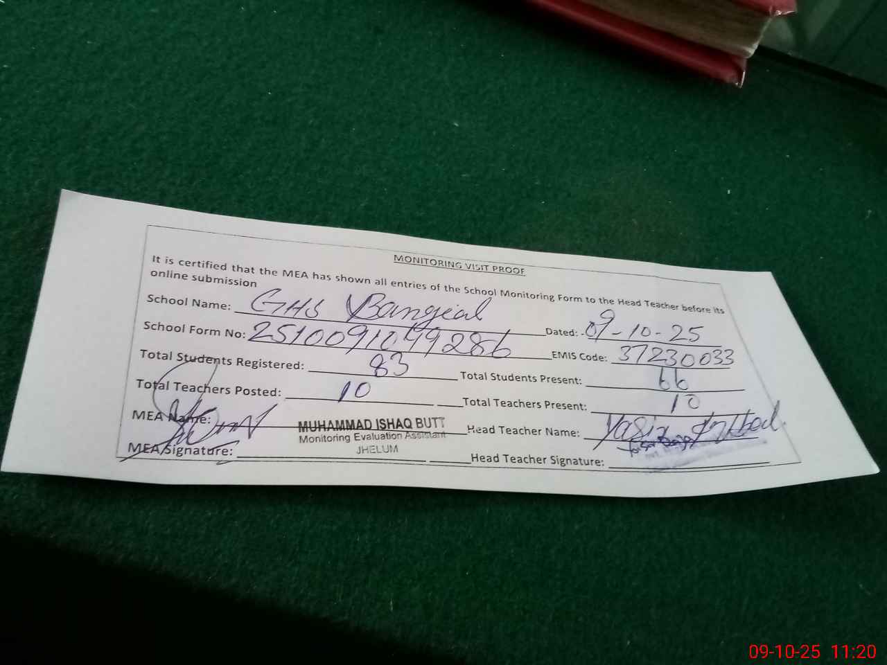 | Monitoring Date: 09-10-2025 | Start Time: 09-10-2025 10:49 AM | End Time: 09-10-2025 11:25 AM | Name of MEA: Mu**** Is**** bu**** | |