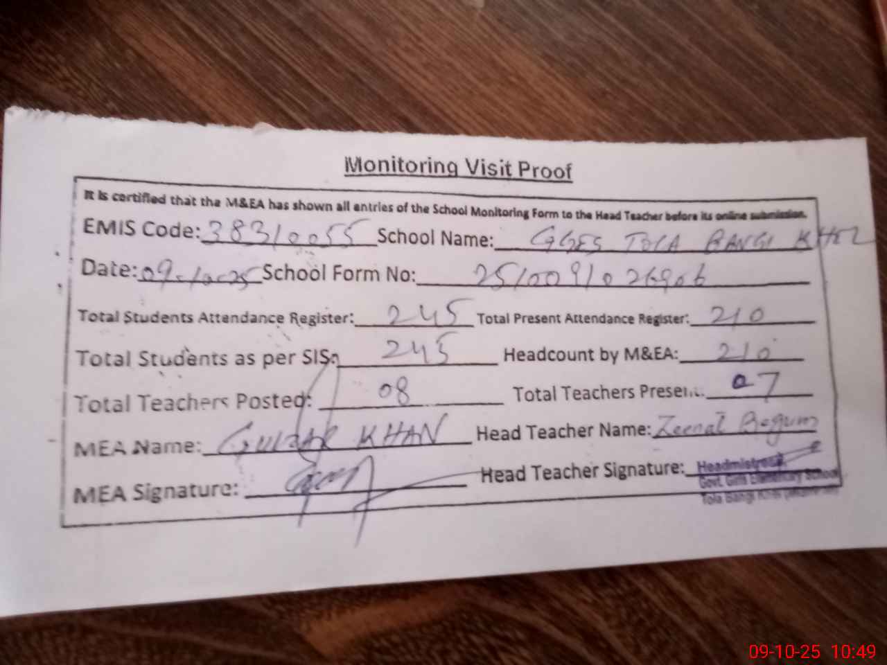 | Certified that this School was Inspected by the Undersigned MEA/DMO Today and the Information Stated Above is as Per Record. | |||||
