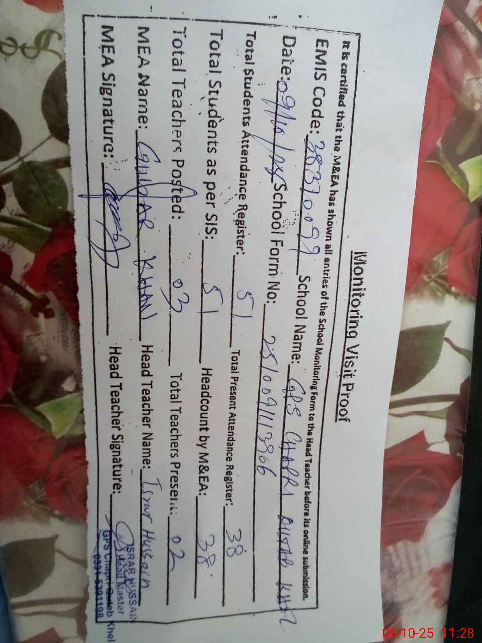 | EMIS Code: 38310099 | Name of School: GPS CHAPRI QUTAB KHEL | |||