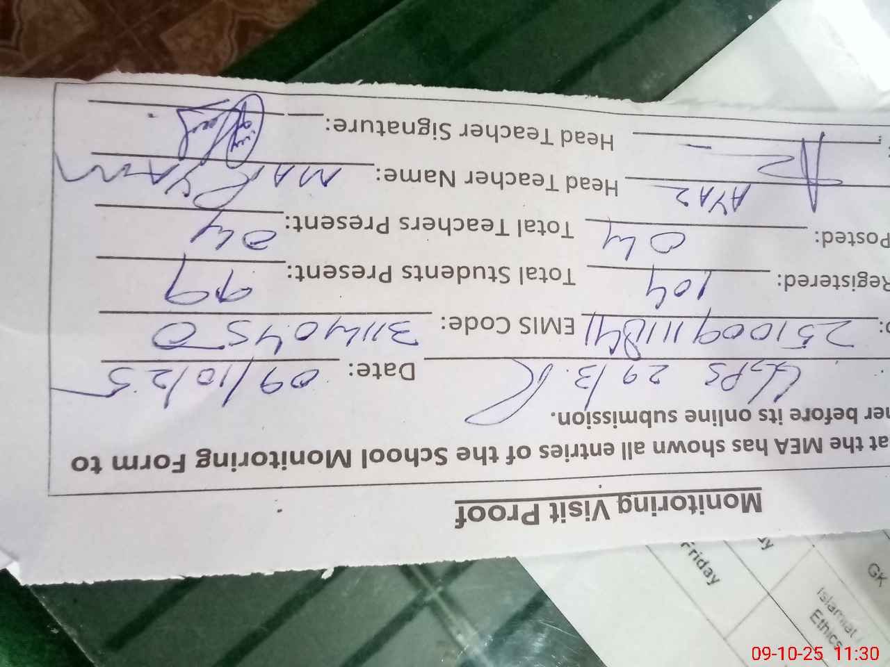 | Attendance Register | Head Teacher | MEA with School | Visit Proof |