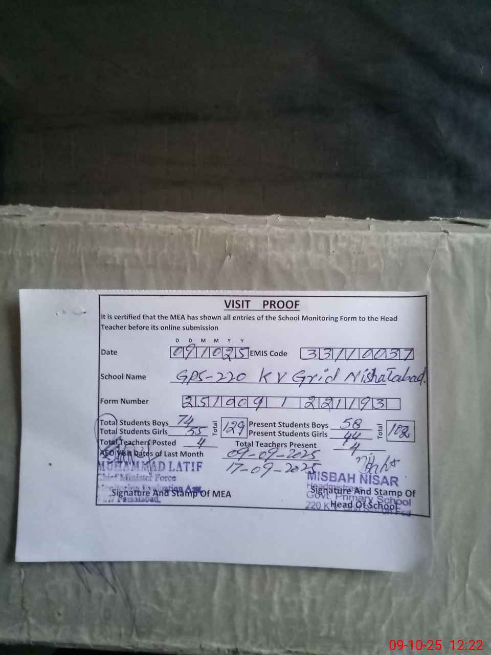 | Certified that this School was Inspected by the Undersigned MEA/DMO Today and the Information Stated Above is as Per Record. | |||||