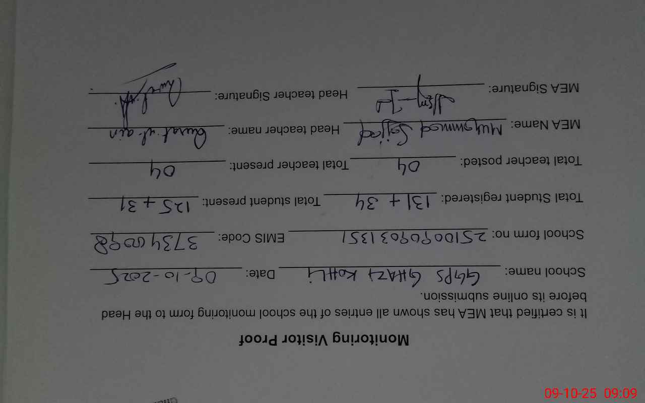 | Monitoring Date: 09-10-2025 | Start Time: 09-10-2025 08:30 AM | End Time: 09-10-2025 09:11 AM | Name of MEA: Mu**** Sa**** | |