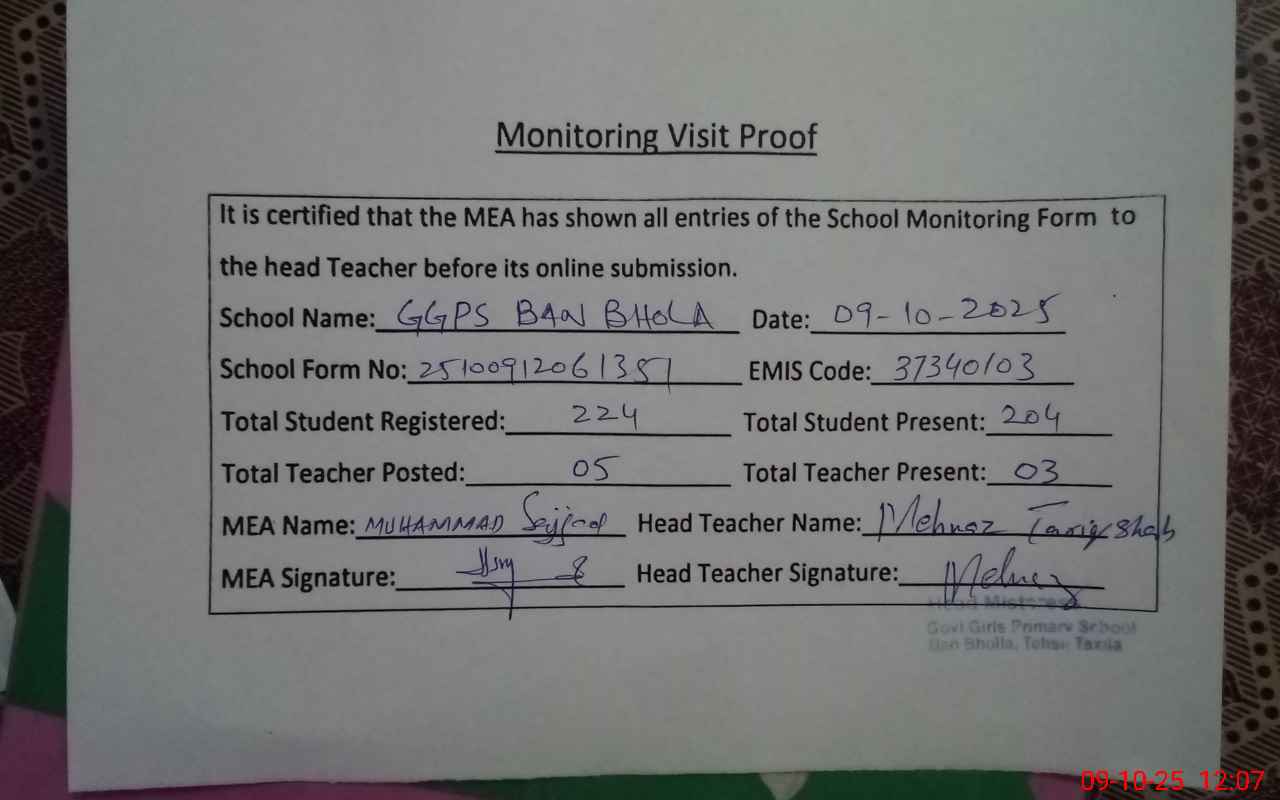 | EMIS Code: 37340103 | Name of School: GGPS BAN BHOLA | |||