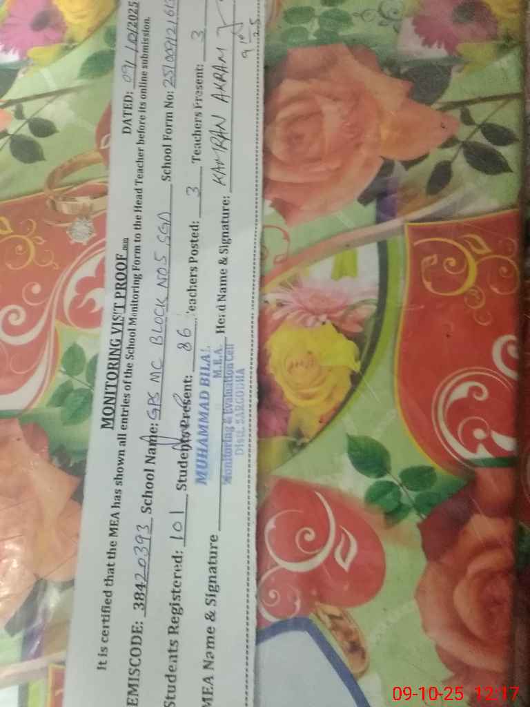 | EMIS Code: 38420393 | Name of School: GPS MC BLOCK NO.5 SARGODHA | |||