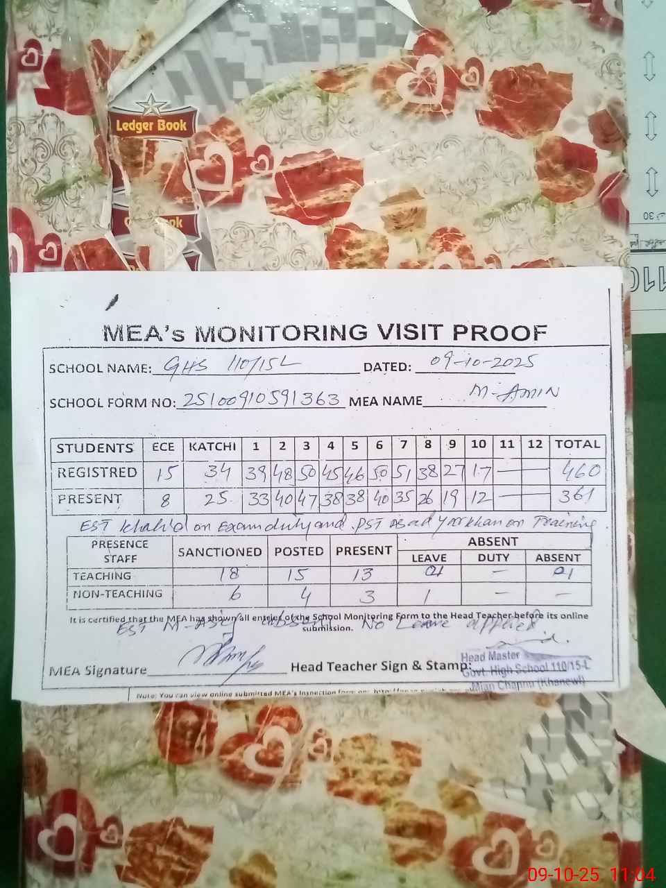 | EMIS Code: 36430020 | Name of School: GHS 110/15-L, MIAN CHANNU | |||