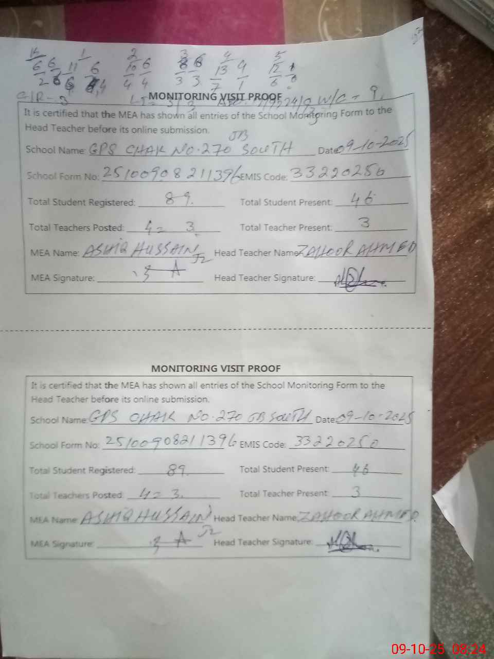 | Attendance Register | Head Teacher | MEA with School | Visit Proof |