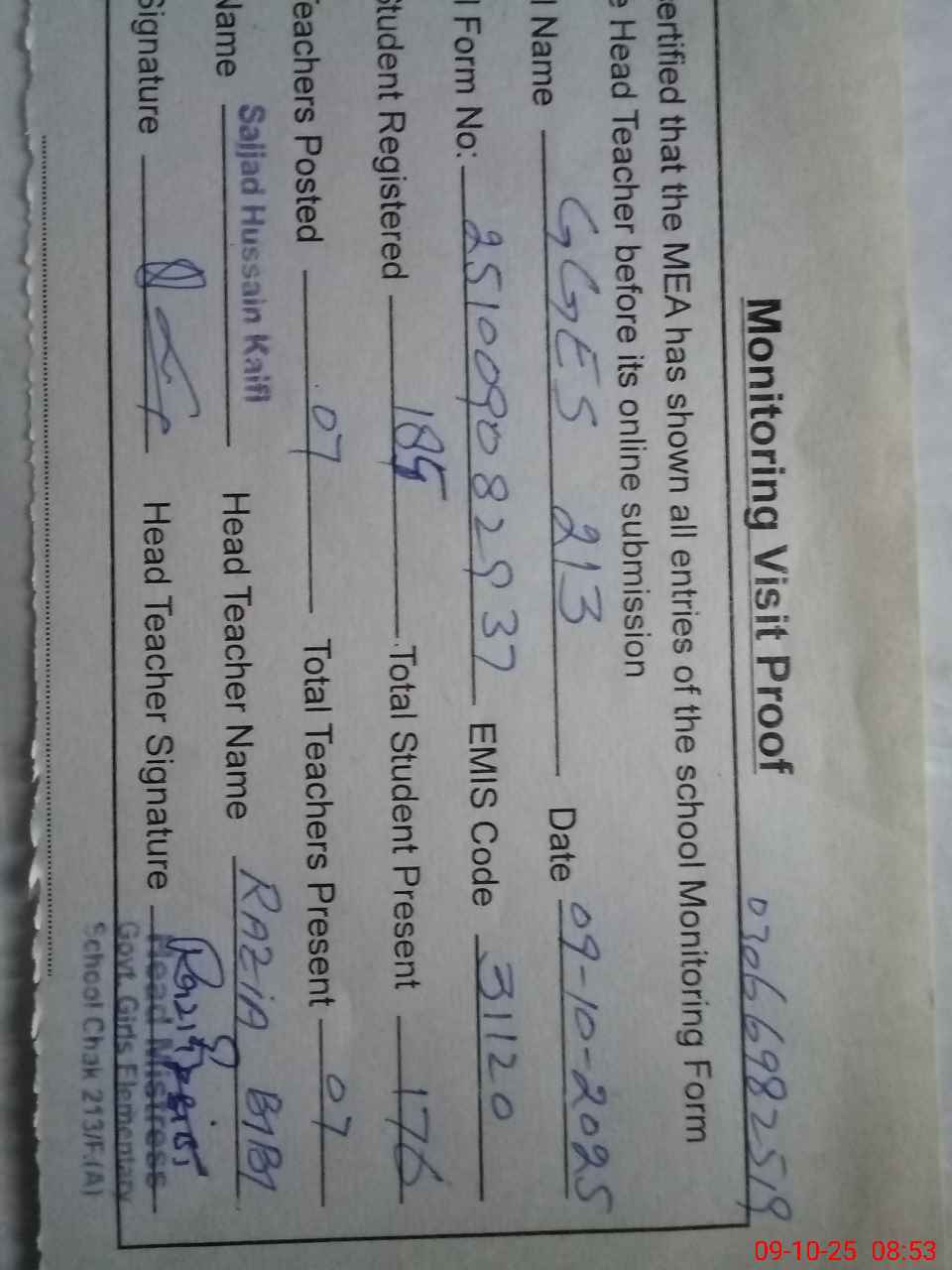 | Name: RA**** BI**** Designation: (School Headmaster's/Headmistress's) SST Phone/Cell Number: 03**** |