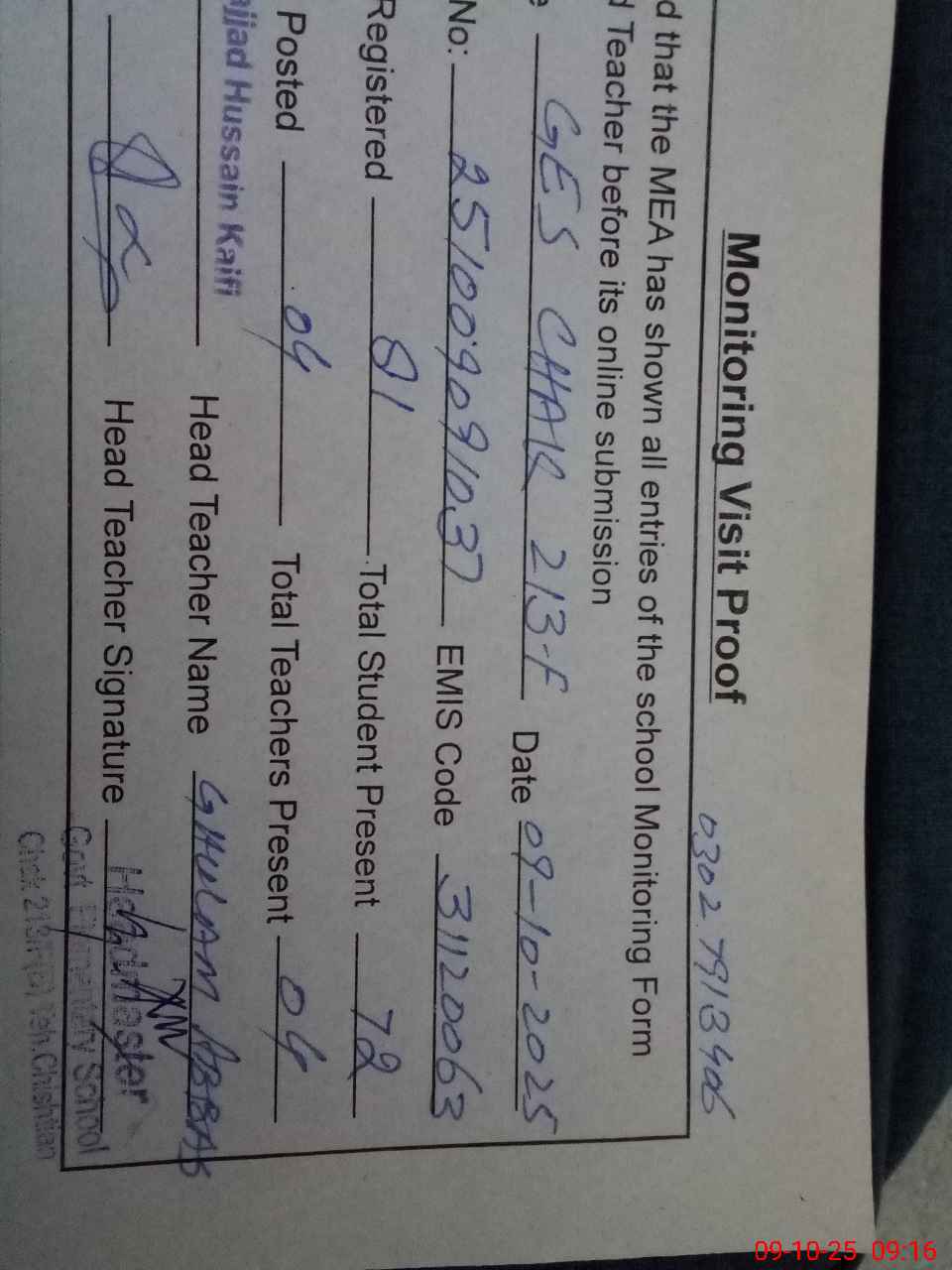 | EMIS Code: 31120063 | Name of School: GES CHAK NO. 213/F | |||