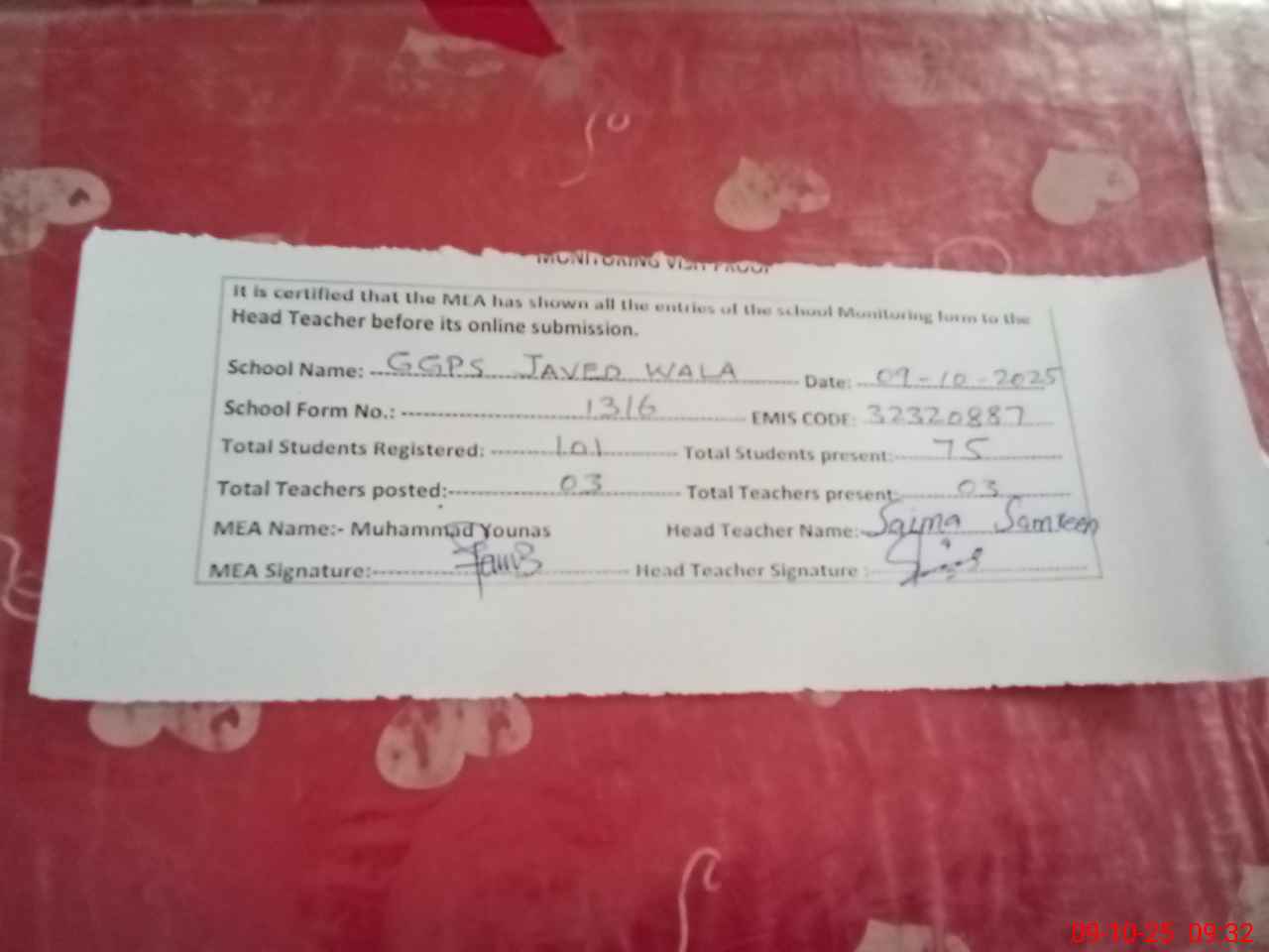 | EMIS Code: 32320887 | Name of School: GGPS JAVED WALA | |||