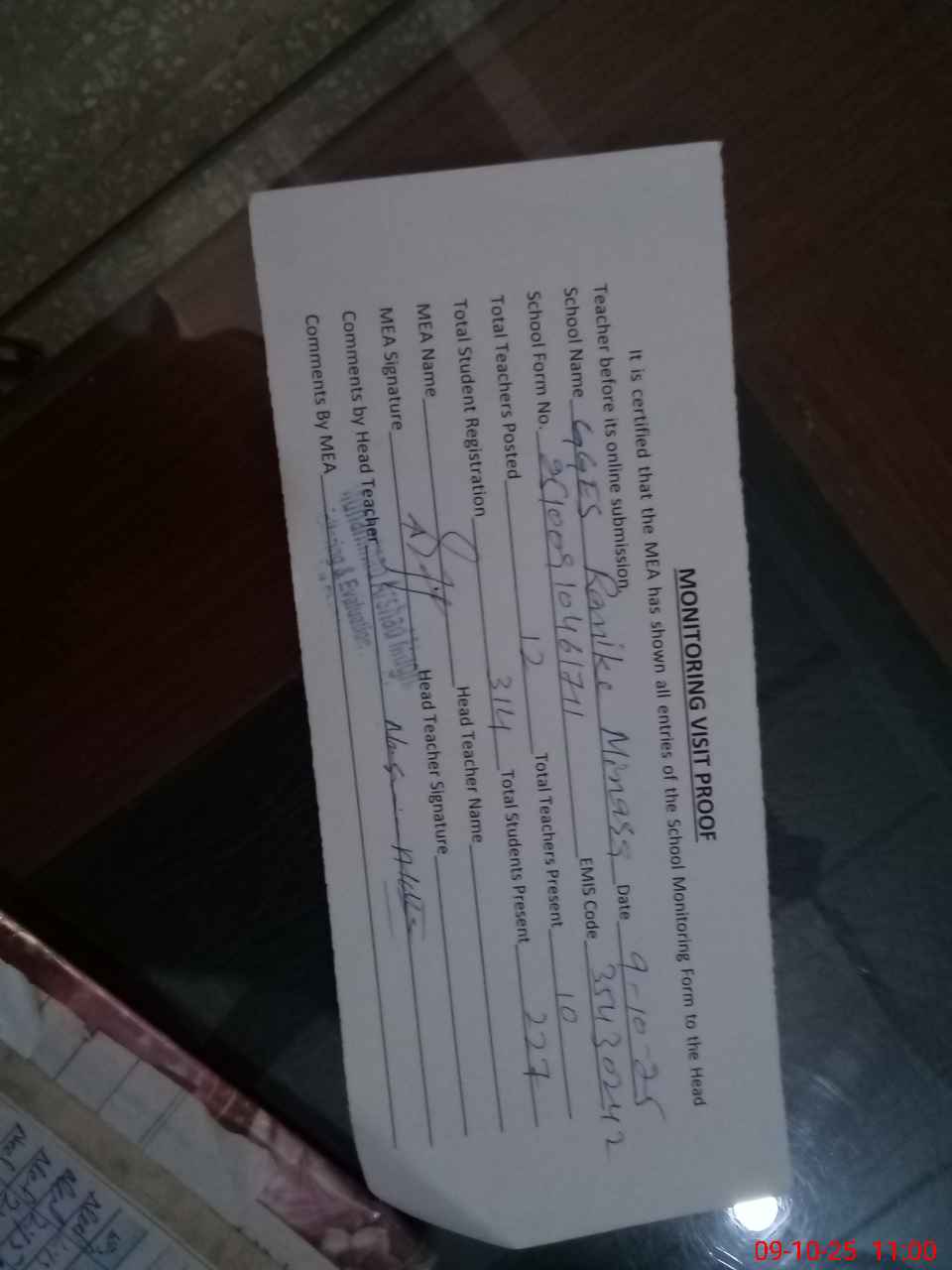 | Attendance Register | Head Teacher | MEA with School | Visit Proof |