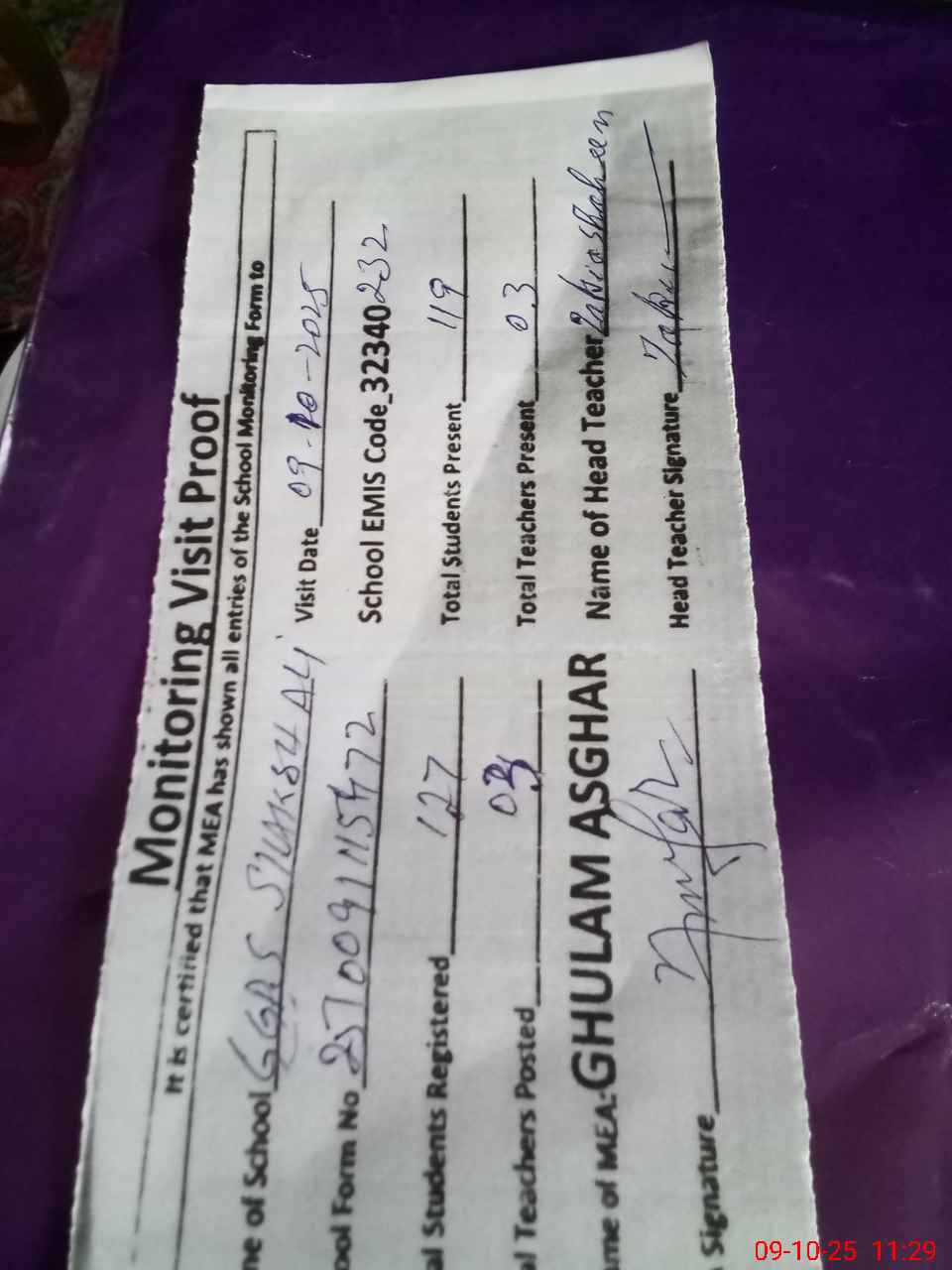 | Attendance Register | Head Teacher | MEA with School | Visit Proof |
