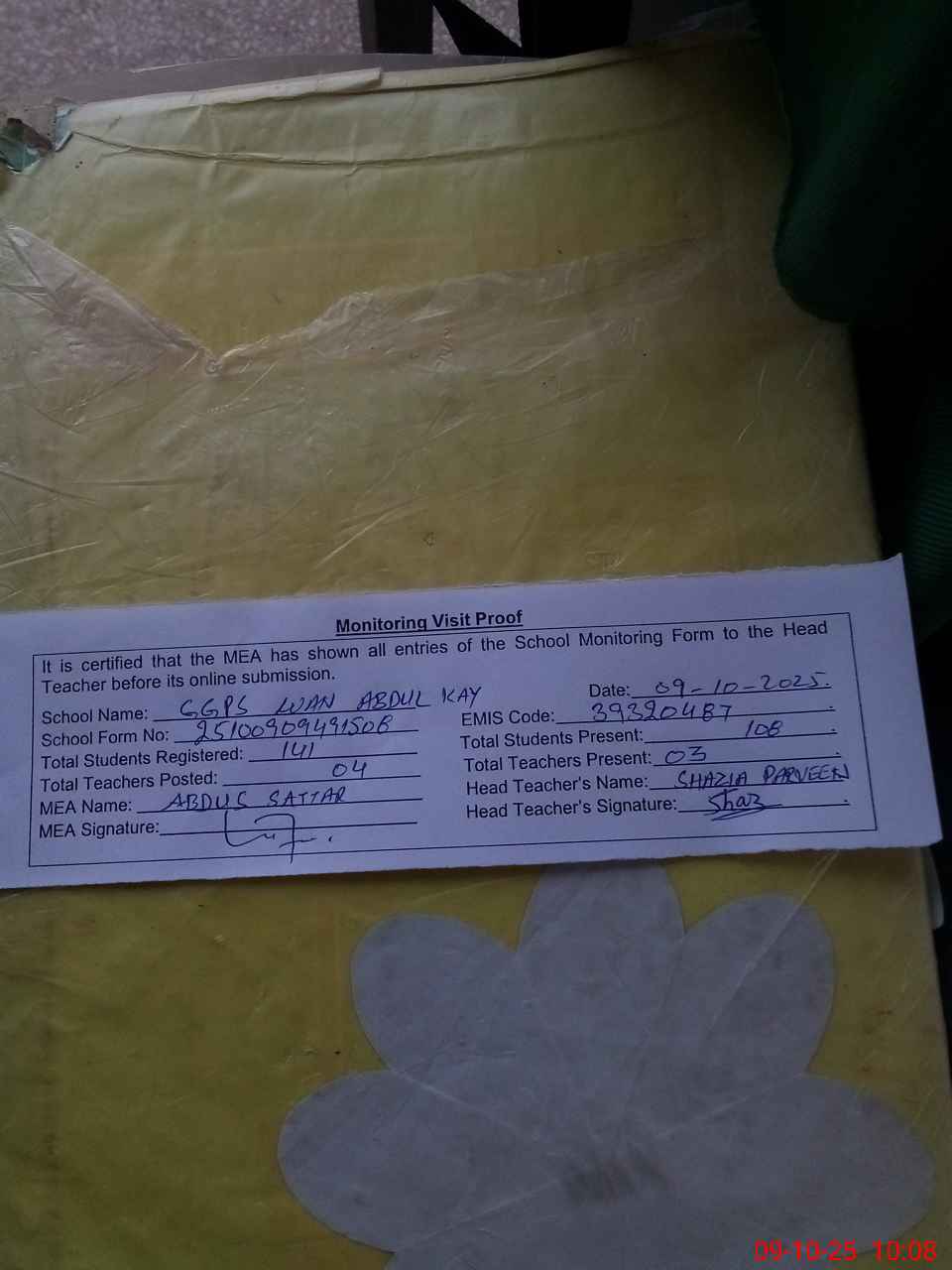| Attendance Register | Head Teacher | MEA with School | Visit Proof |