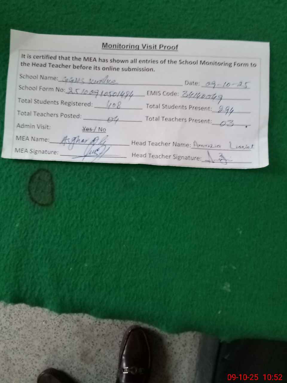 | Monitoring Date: 09-10-2025 | Start Time: 09-10-2025 10:19 AM | End Time: 09-10-2025 10:54 AM | Name of MEA: N-**** Al**** | |