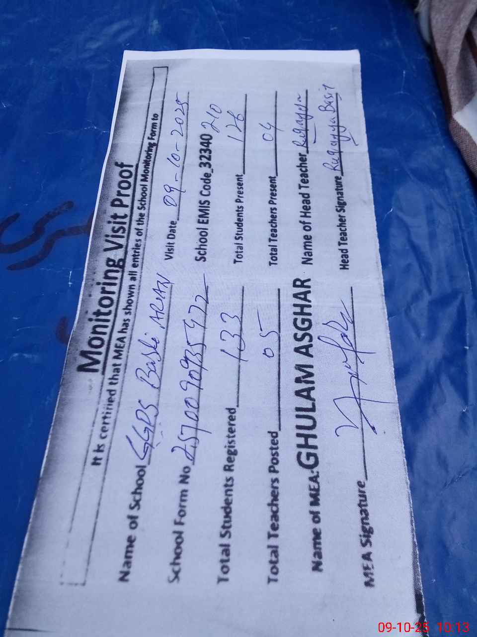 | Attendance Register | Head Teacher | MEA with School | Visit Proof |