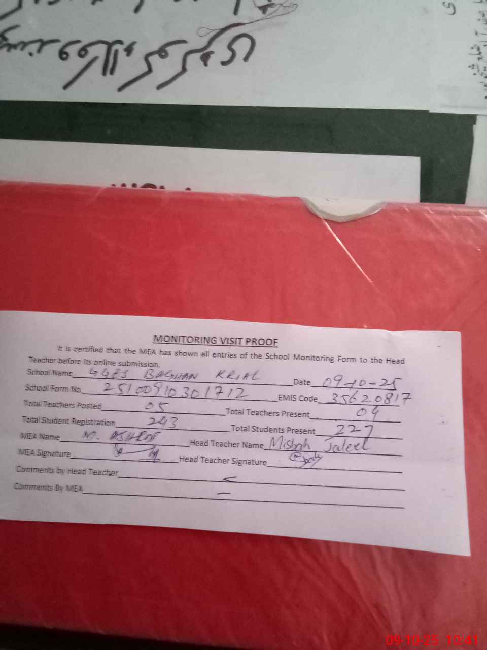 | Attendance Register | Head Teacher | MEA with School | Visit Proof |