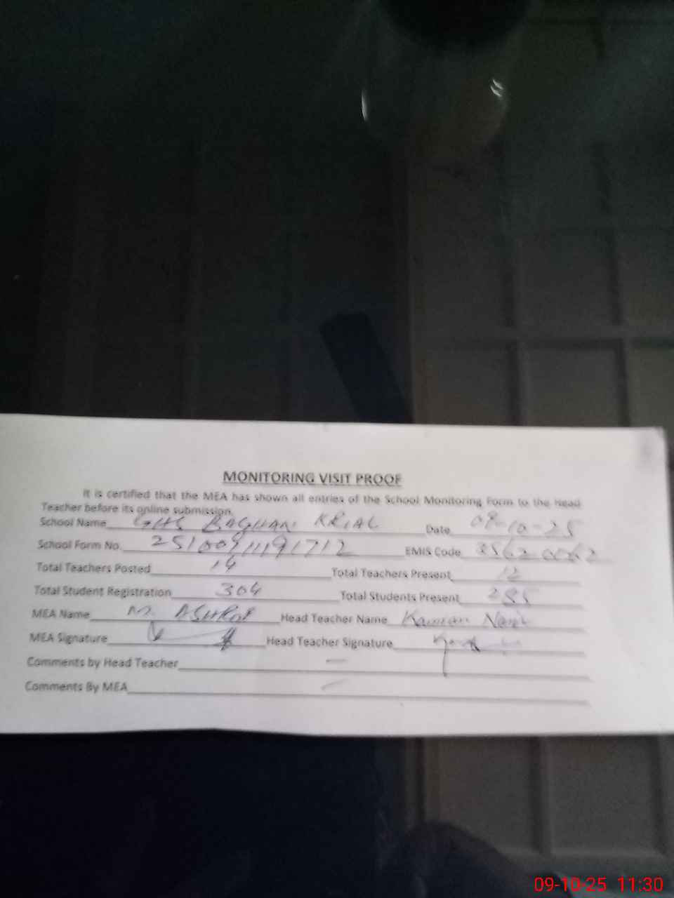| Attendance Register | Head Teacher | MEA with School | Visit Proof |