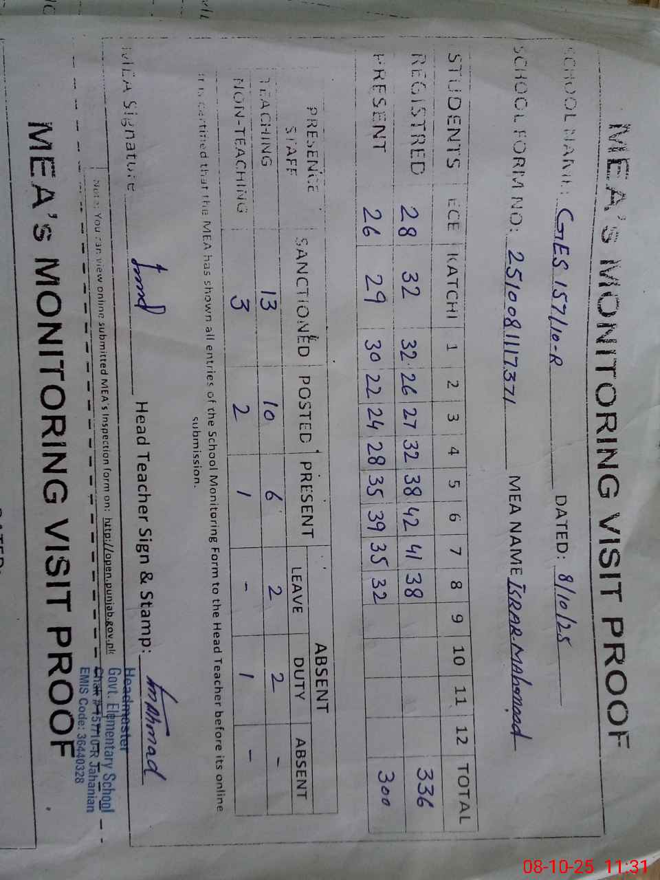 | EMIS Code: 36440328 | Name of School: GES 157/10-R, P/O JUNGLE MARYALA, JAHANIAN | |||