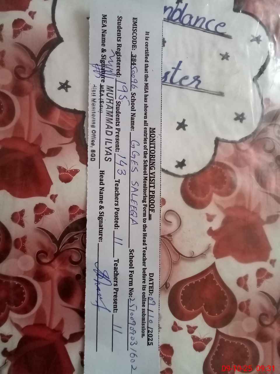 | Attendance Register | Head Teacher | MEA with School | Visit Proof |