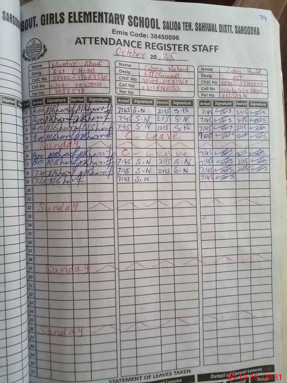| CNIC | Full Name | Designation | R/C | Absence during last cal. month |