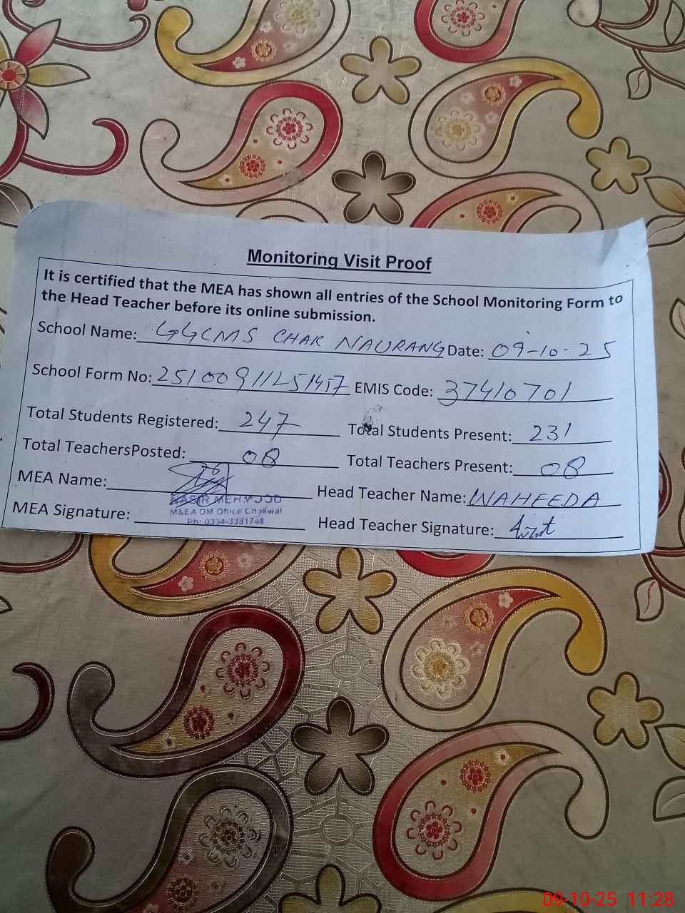 | Attendance Register | Head Teacher | MEA with School | Visit Proof |