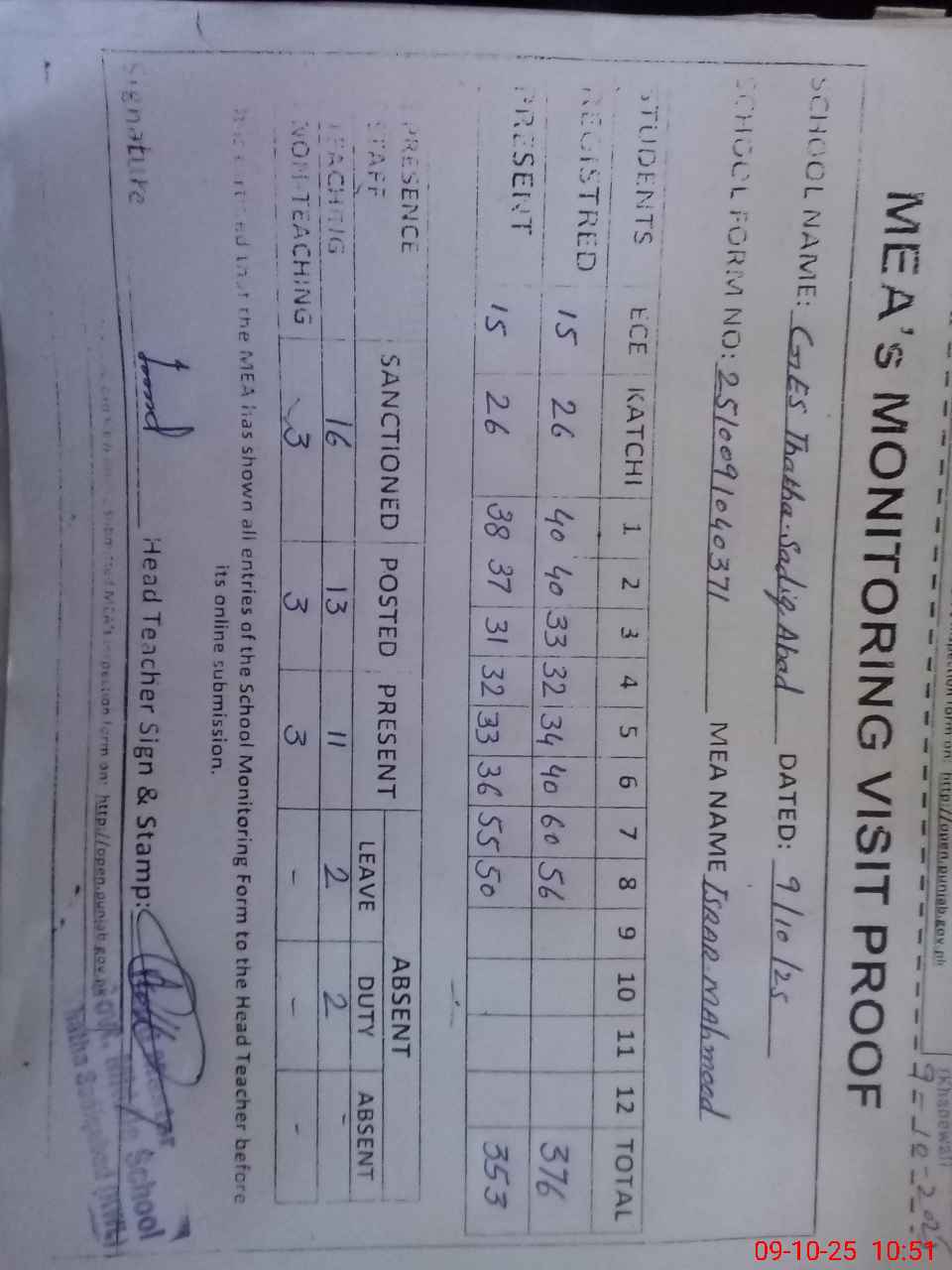 | Attendance Register | Head Teacher | MEA with School | Visit Proof |