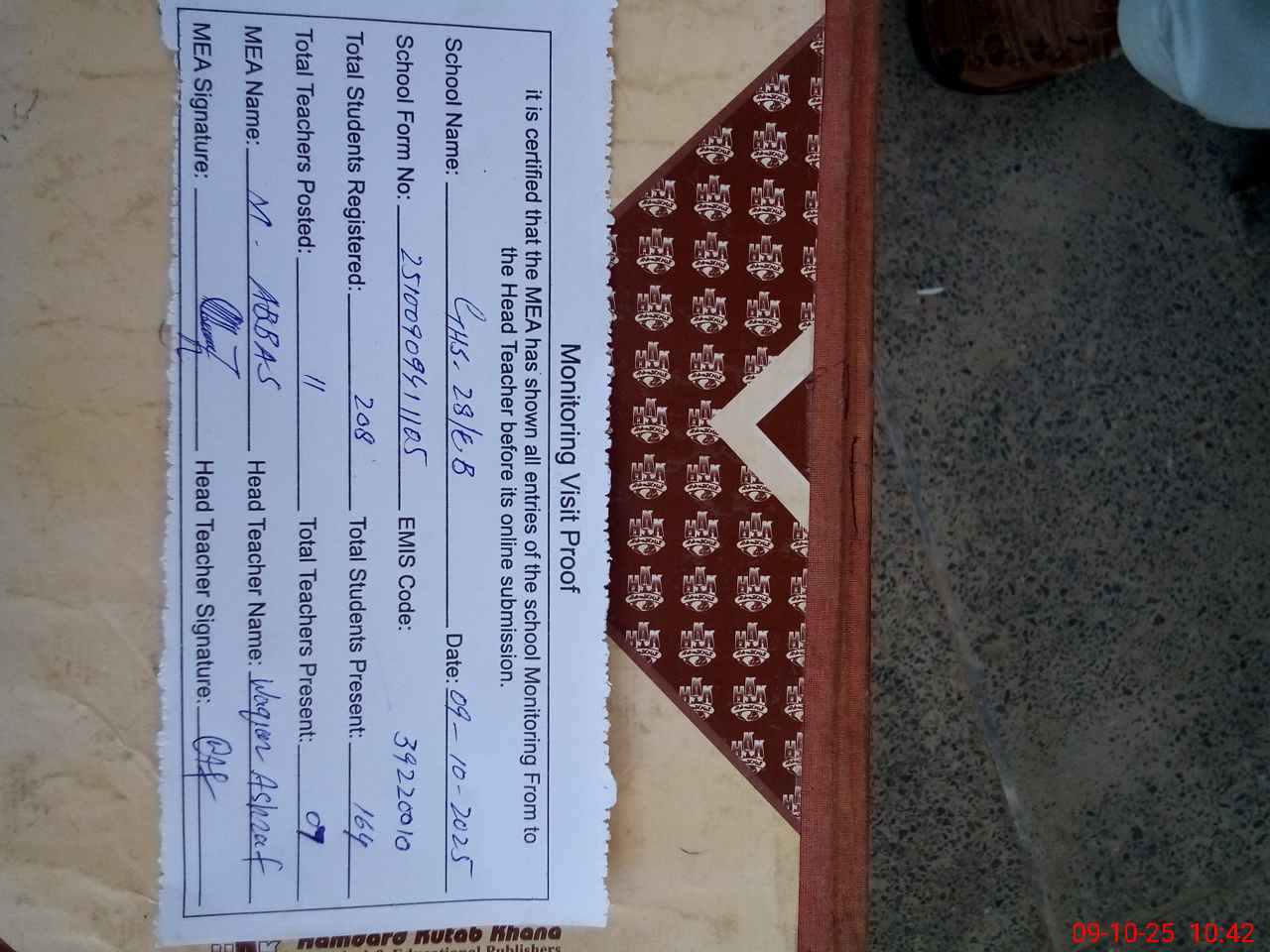 | Attendance Register | Head Teacher | MEA with School | Visit Proof |