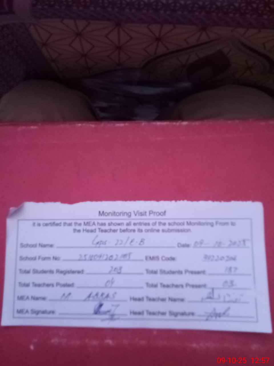 | Attendance Register | Head Teacher | MEA with School | Visit Proof |