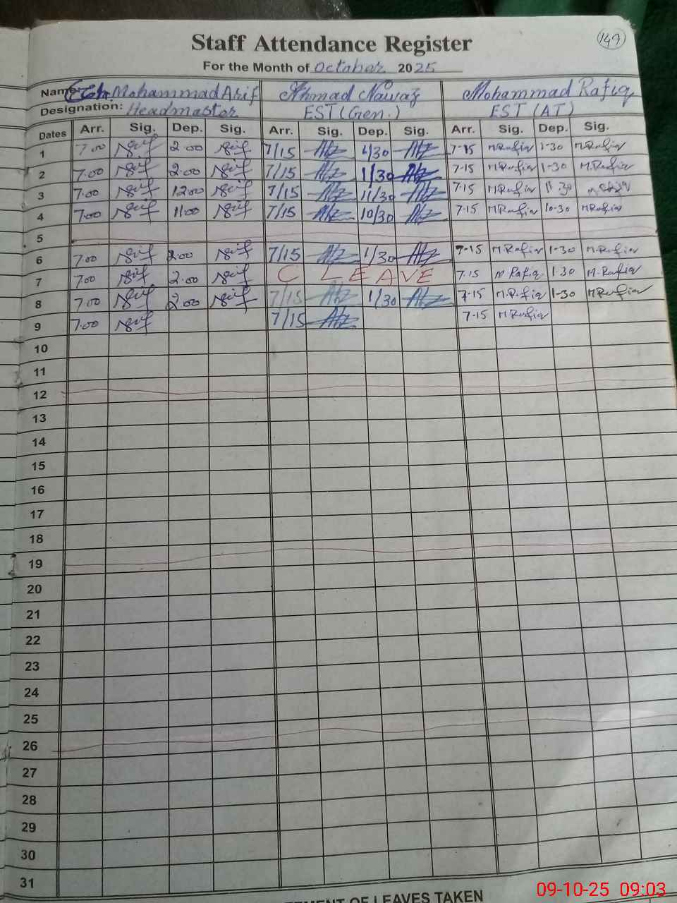 | CNIC | Full Name | Designation | R/C | Absence during last cal. month |