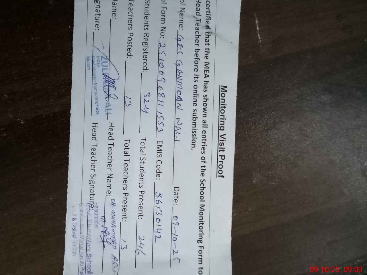 | Monitoring Date: 09-10-2025 | Start Time: 09-10-2025 08:11 AM | End Time: 09-10-2025 09:04 AM | Name of MEA: Zu**** Al**** | |