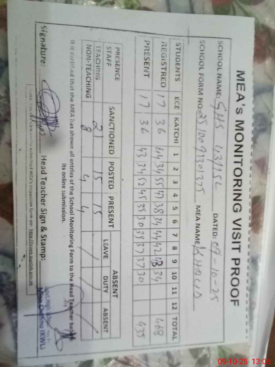 | Attendance Register | Head Teacher | MEA with School | Visit Proof |