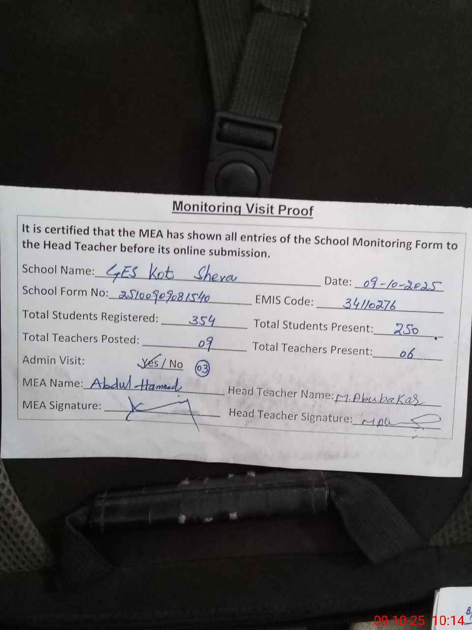 | Attendance Register | Head Teacher | MEA with School | Visit Proof |