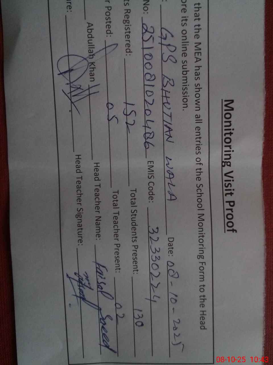 | EMIS Code: 32330224 | Name of School: GPS BHUTTIAN WALA | |||