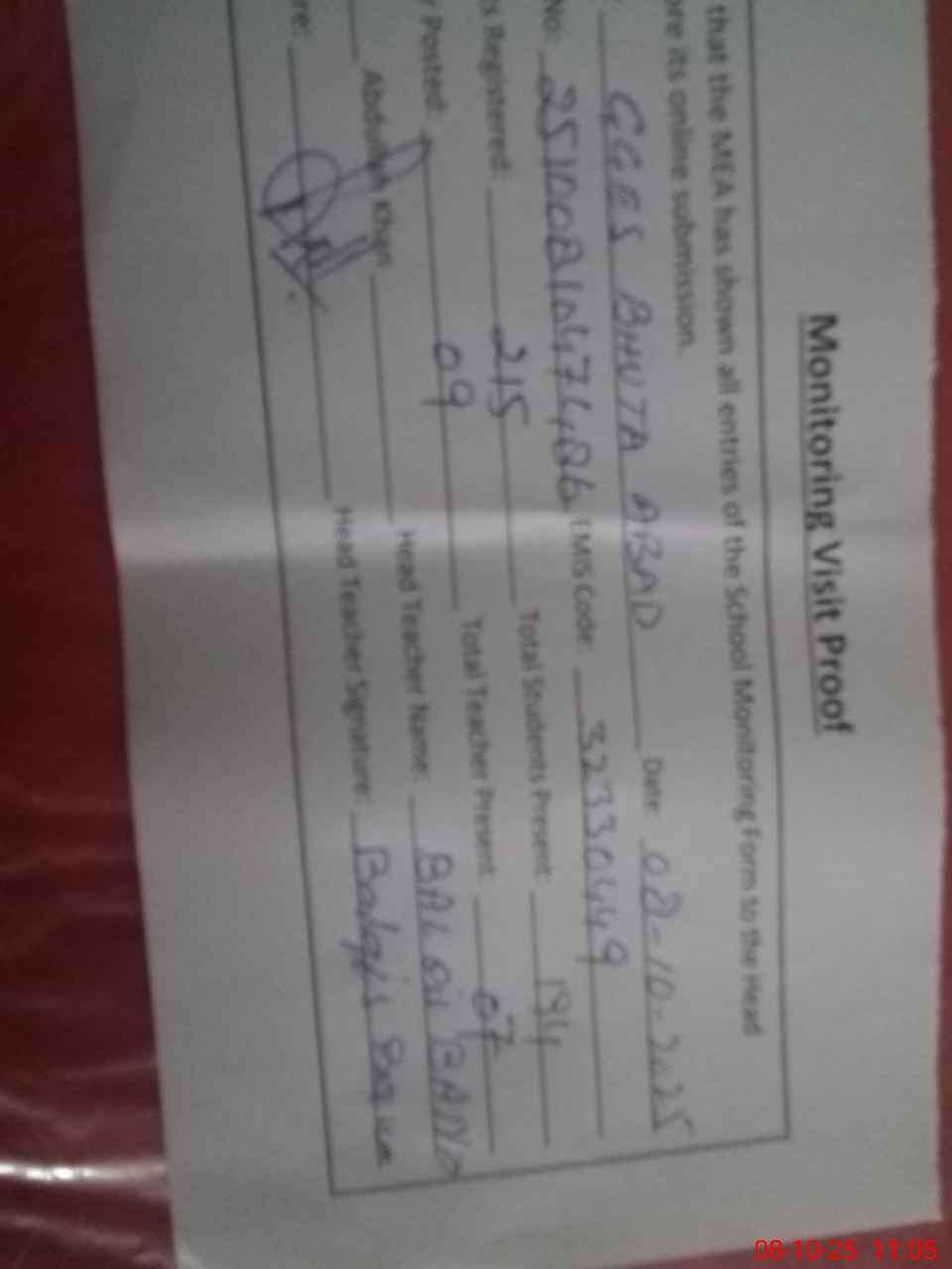 | Certified that this School was Inspected by the Undersigned MEA/DMO Today and the Information Stated Above is as Per Record. | |||||