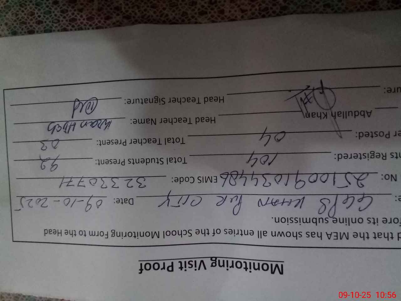 | Monitoring Date: 09-10-2025 | Start Time: 09-10-2025 10:34 AM | End Time: 09-10-2025 10:56 AM | Name of MEA: Ab**** Kh**** | |