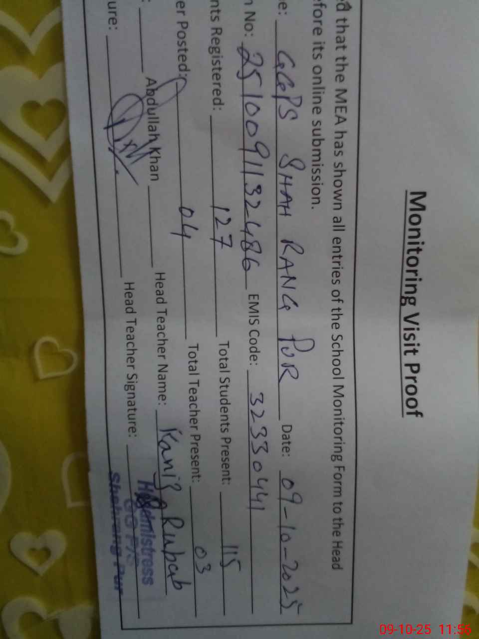 | EMIS Code: 32330441 | Name of School: GGPS SHAH RANG PUR | |||