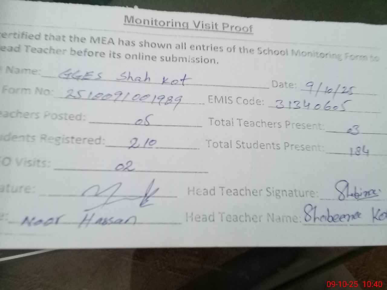 | Attendance Register | Head Teacher | MEA with School | Visit Proof |