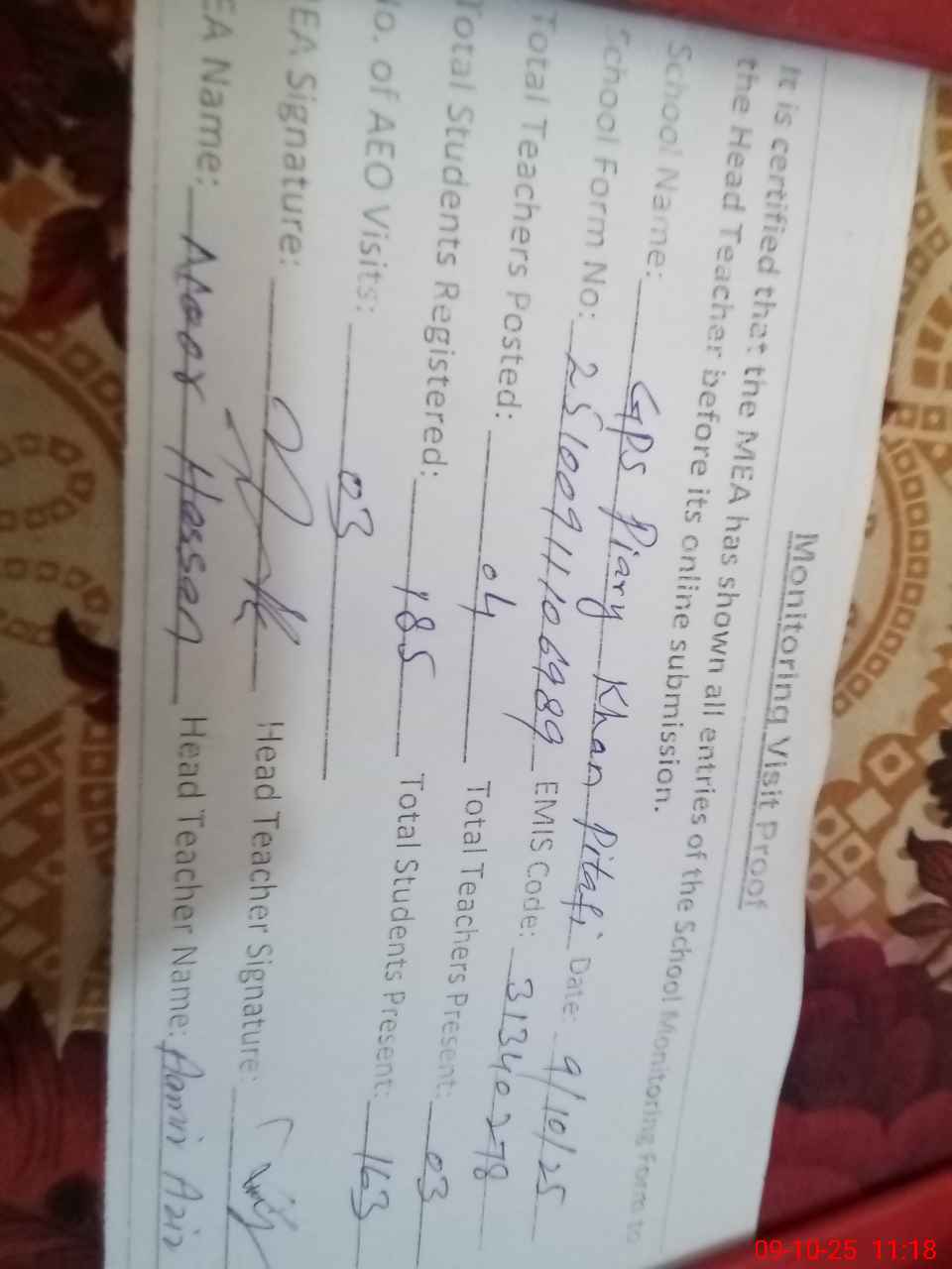 | Attendance Register | Head Teacher | MEA with School | Visit Proof |
