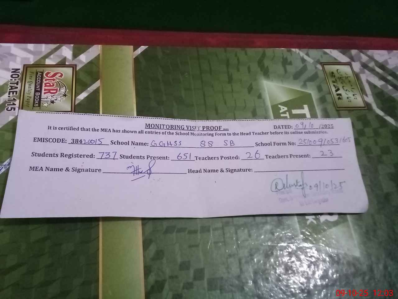 | EMIS Code: 38420015 | Name of School: GGHSS CHAK NO.88 SB | |||