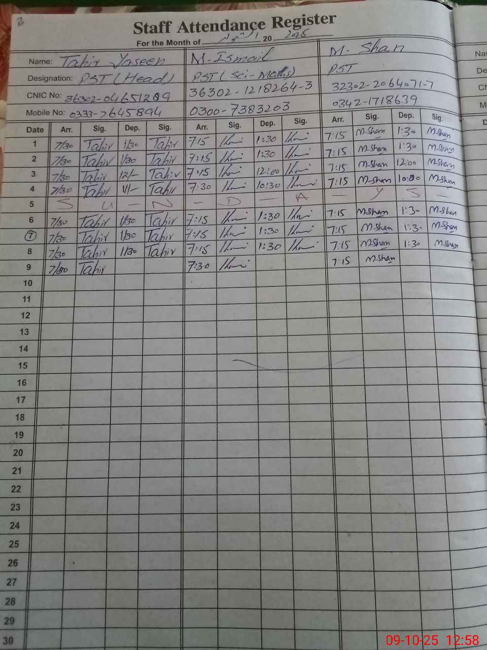 | CNIC | Full Name | Designation | R/C | Absence during last cal. month |