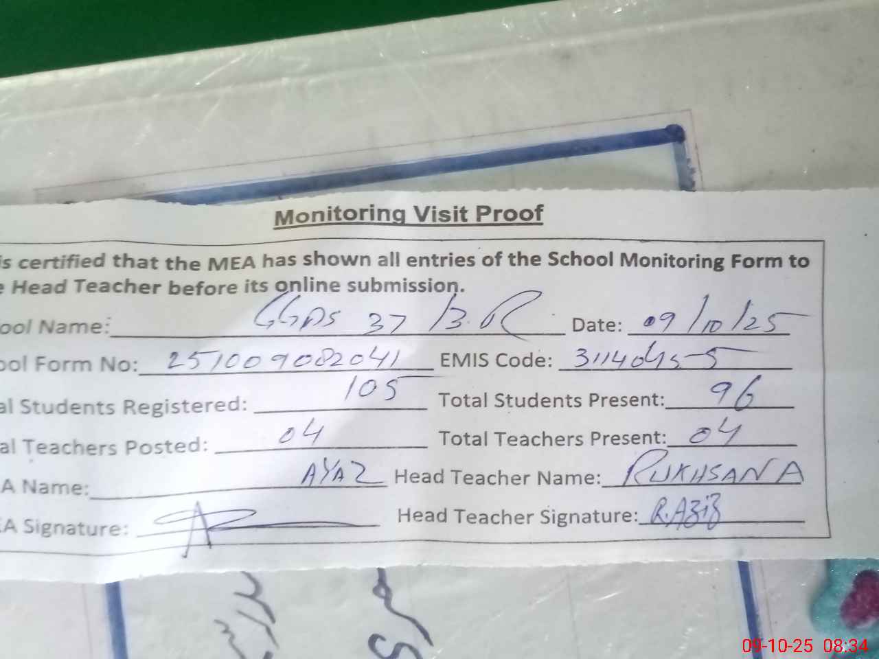 | Monitoring Date: 09-10-2025 | Start Time: 09-10-2025 08:20 AM | End Time: 09-10-2025 08:34 AM | Name of MEA: Ay**** Me**** BN**** 13 | |