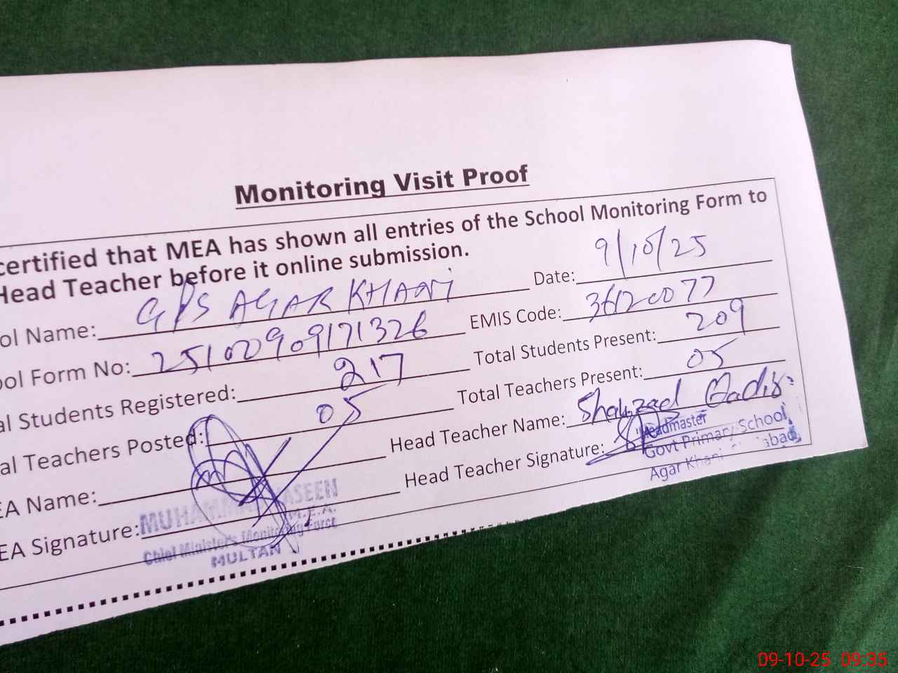 | Monitoring Date: 09-10-2025 | Start Time: 09-10-2025 09:17 AM | End Time: 09-10-2025 09:35 AM | Name of MEA: MU**** YA**** | |