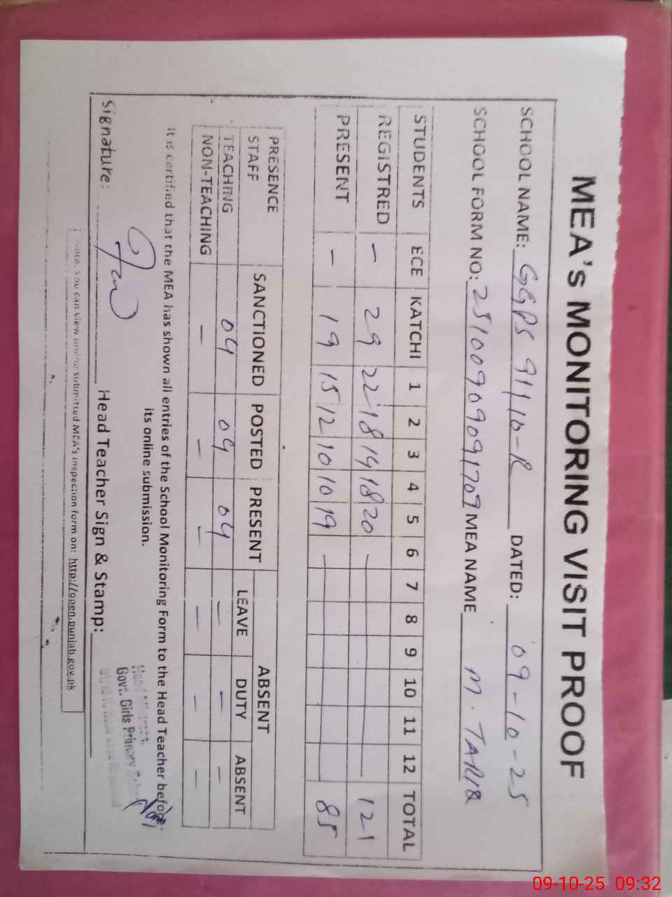 | Attendance Register | Head Teacher | MEA with School | Visit Proof |
