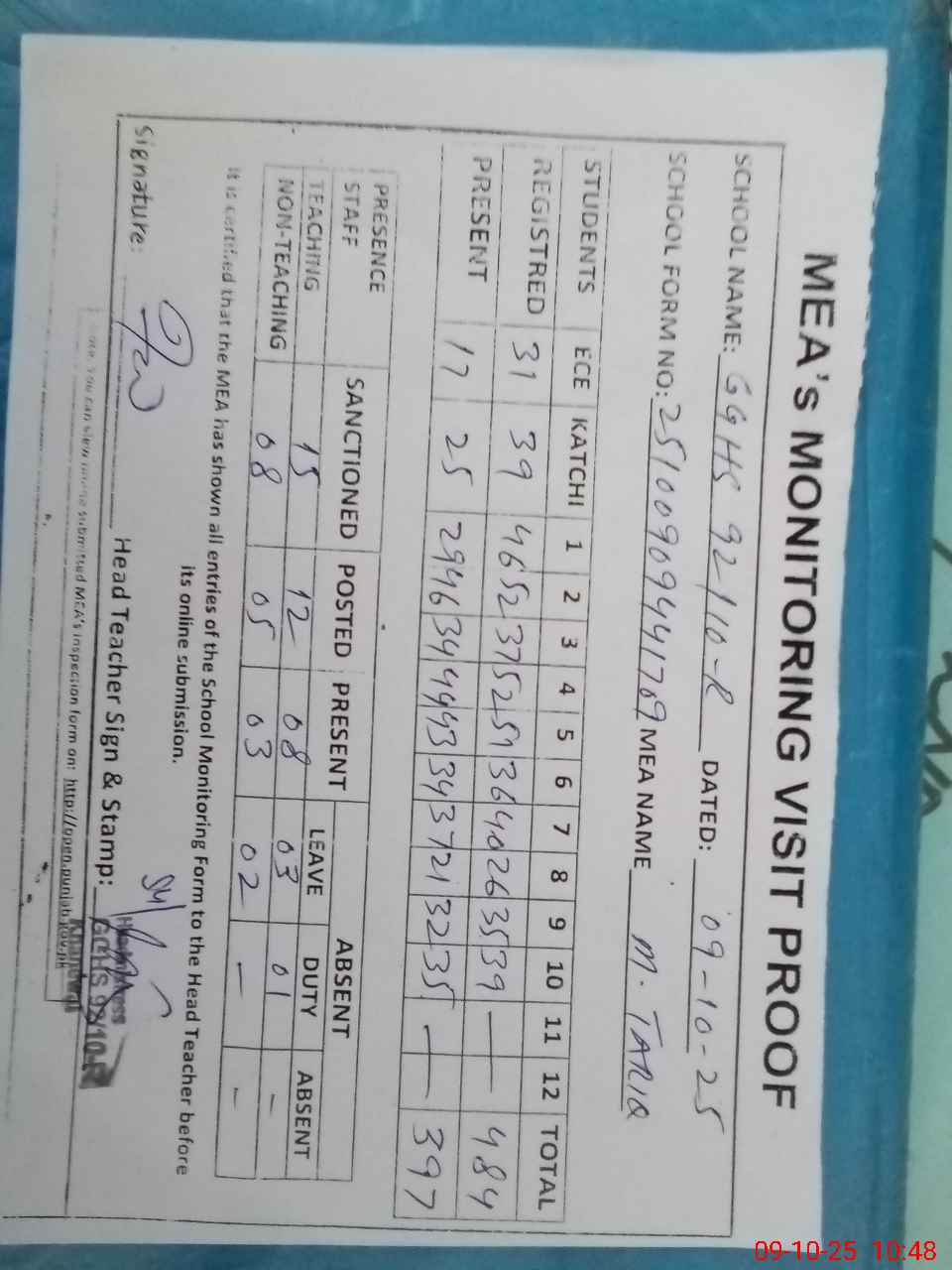| Monitoring Date: 09-10-2025 | Start Time: 09-10-2025 09:43 AM | End Time: 09-10-2025 10:52 AM | Name of MEA: MU**** TA**** | |