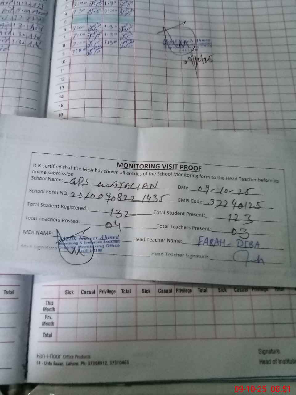 | Attendance Register | Head Teacher | MEA with School | Visit Proof |