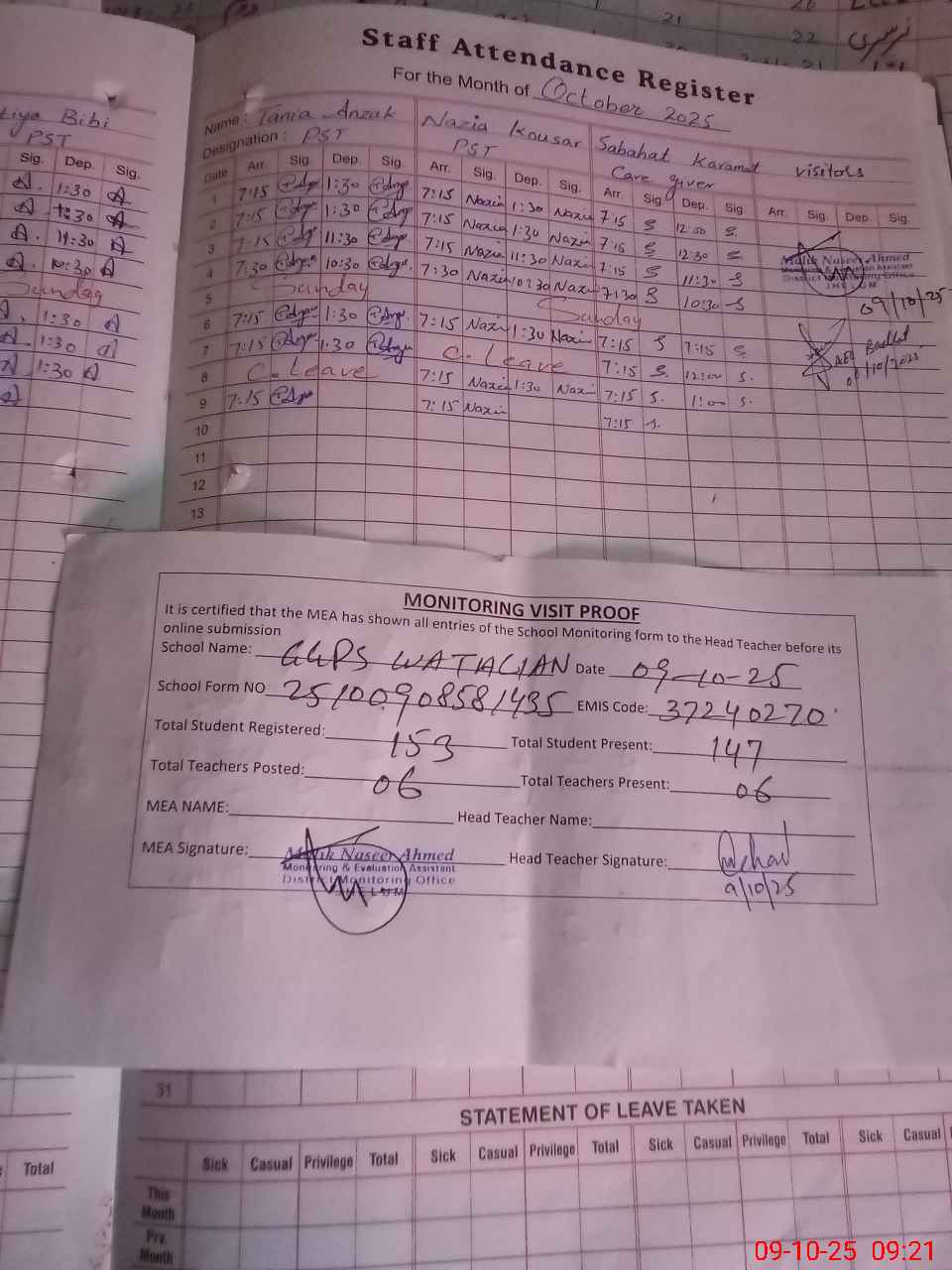 | Attendance Register | Head Teacher | MEA with School | Visit Proof |