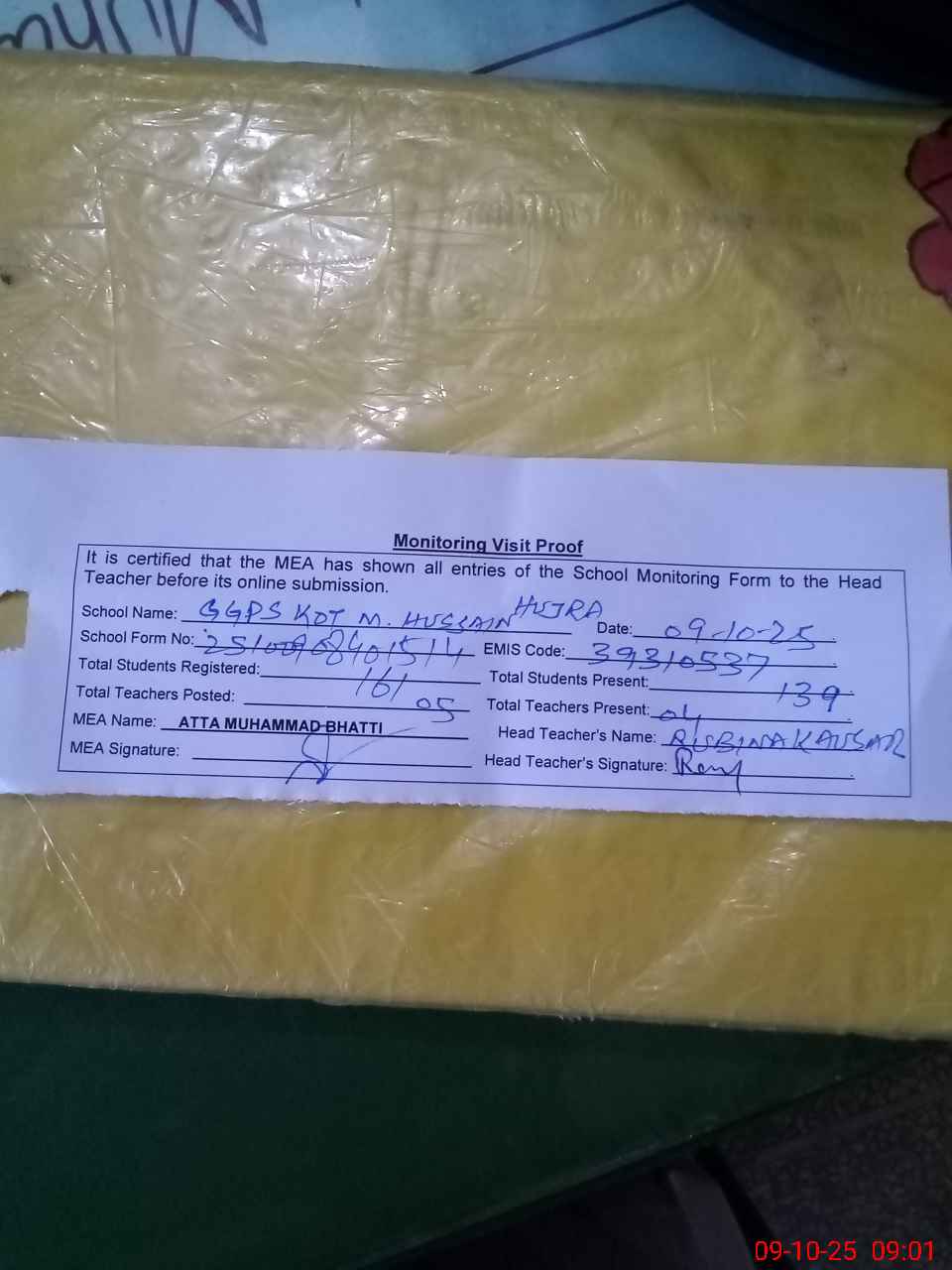 | Attendance Register | Head Teacher | MEA with School | Visit Proof |