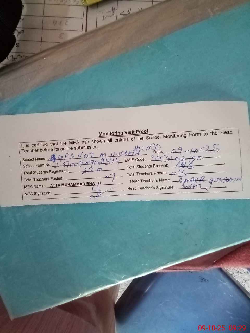 | EMIS Code: 39310230 | Name of School: GPS KOT MUHAMMAD HUSSAIN (HUJRA) | |||