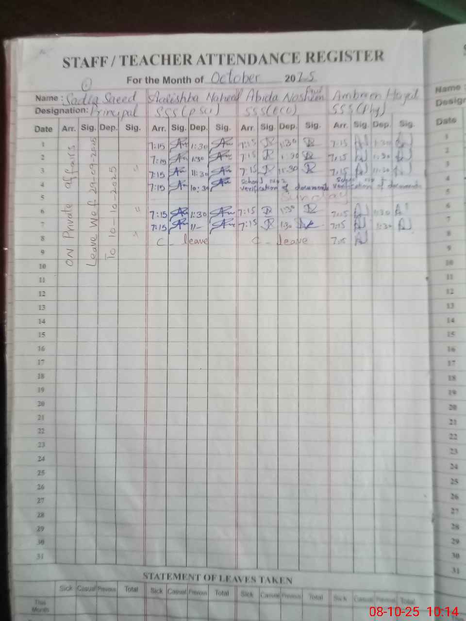 | Leave | Duty | Absent | Maternity | Medical | Ex- Pak |