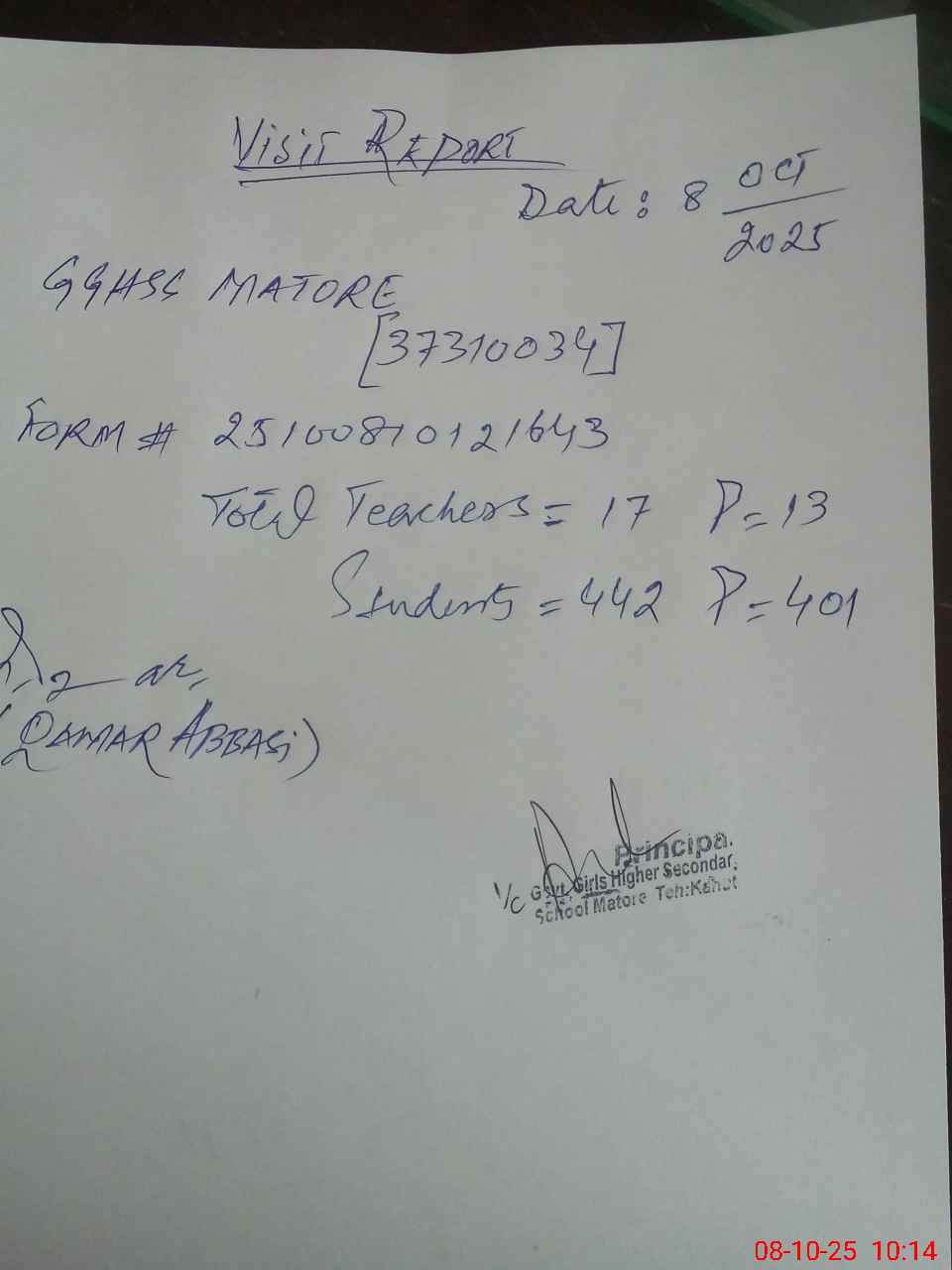| Certified that this School was Inspected by the Undersigned MEA/DMO Today and the Information Stated Above is as Per Record. | |||||
