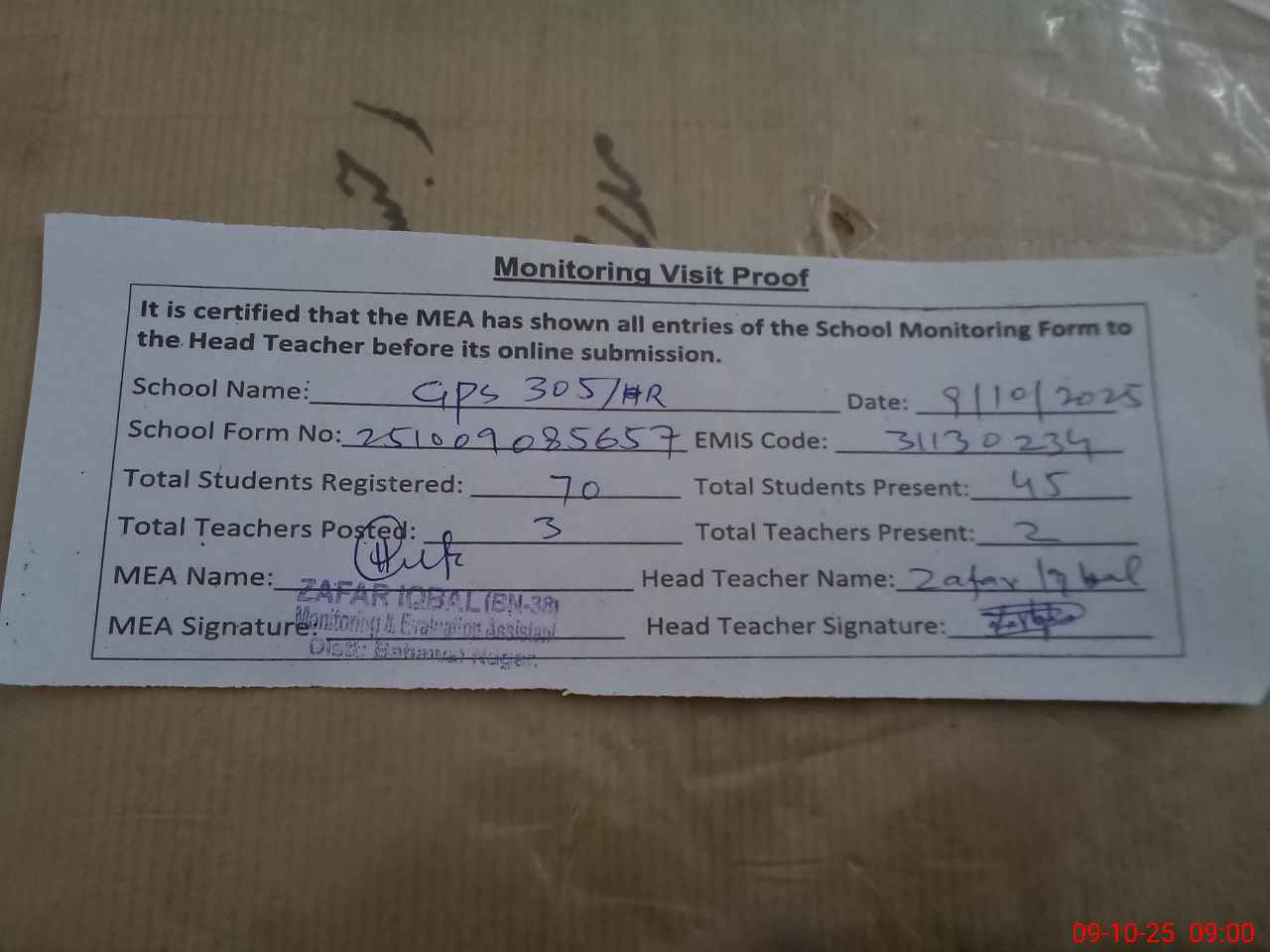 | Monitoring Date: 09-10-2025 | Start Time: 09-10-2025 08:40 AM | End Time: 09-10-2025 09:00 AM | Name of MEA: Za**** Iq**** BN**** | |